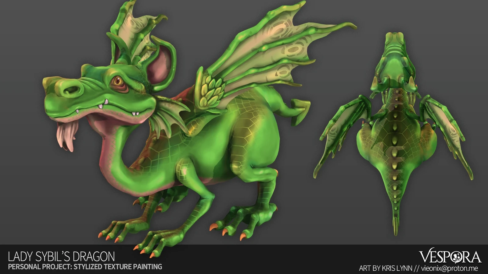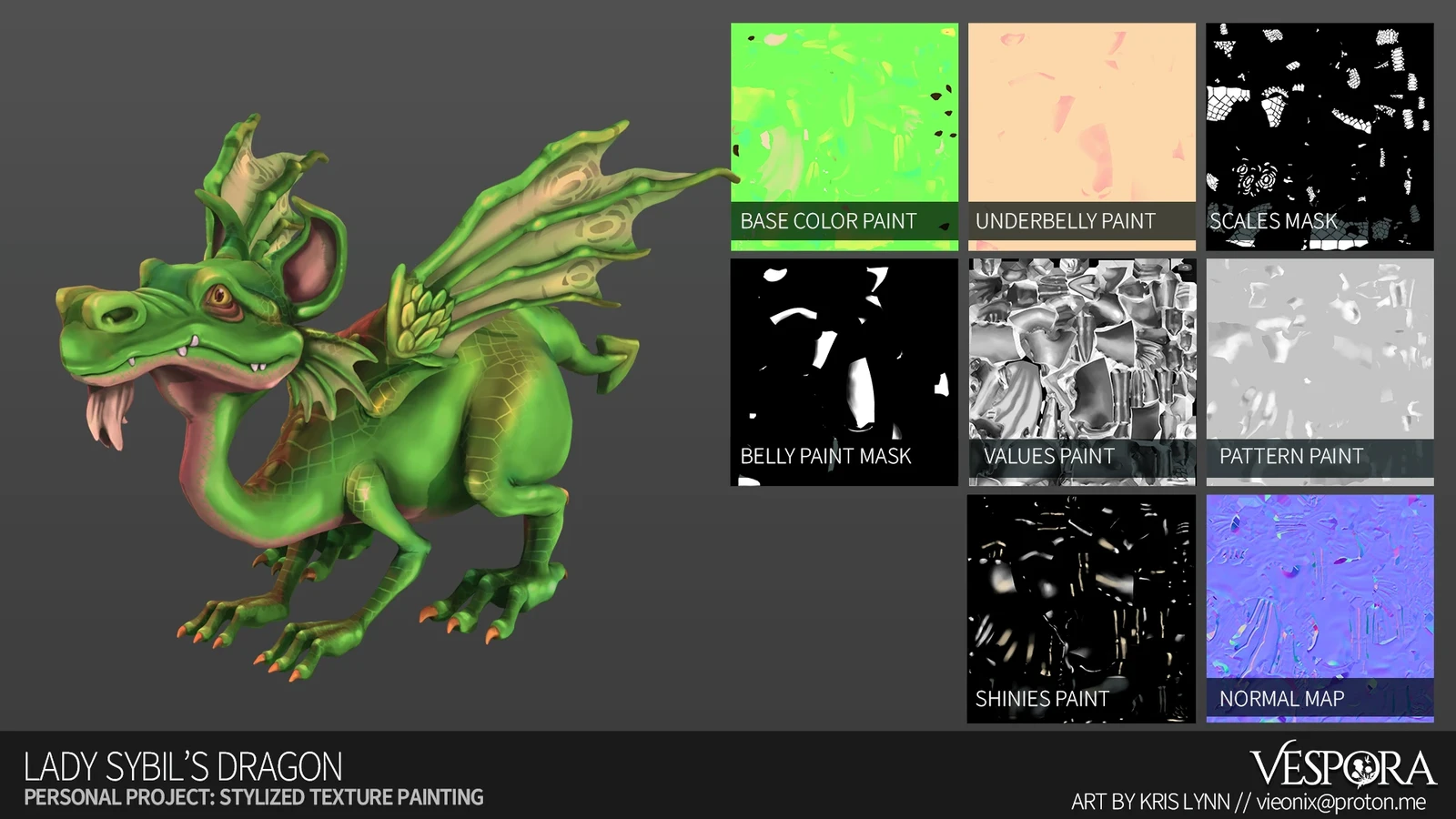 This dragon concept is from Terry Pratchett's Discworld Illustrated Novel, "The Last Hero", illustrated by Paul Kidby. I adore Kidby's style, and the similarities to the World of Warcraftian art style could not be ignored. While the focus of the project was in the texture painting, I got a lot of excellent sculpting and retopology practice in as well. All of the texture painting was done in Blender with standard brushes! I used a multi-layered approach where I incorporated alpha masks for the scale pattern and separation of certain colors, which was a bit of an experiment that turned out beautifully.